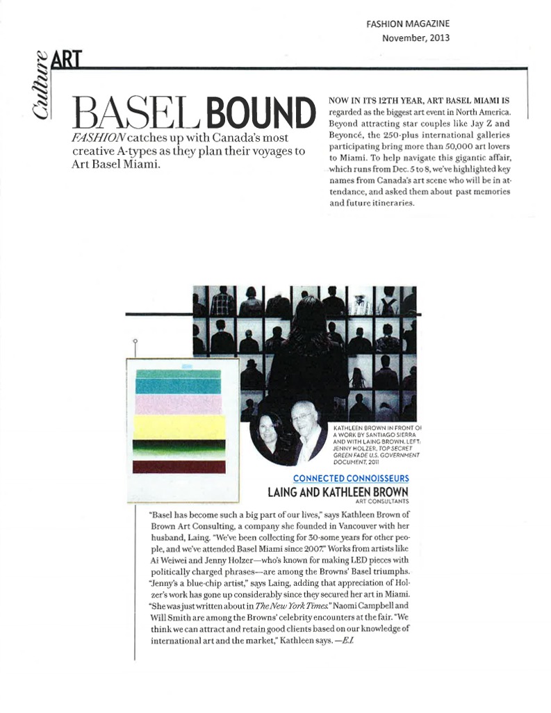 Basel (Miami) Bound Posted on 2013-11-01 Kathleen and Laing Brown are interviewed in Fashion Magazine.